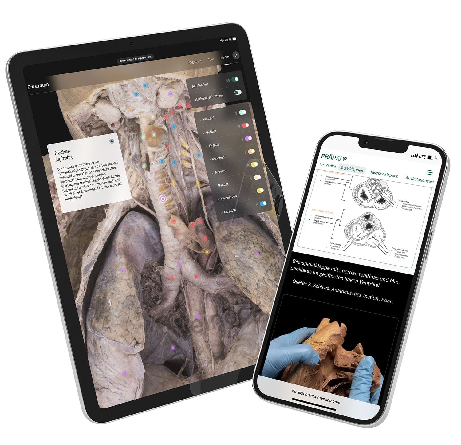 Die PräpApp löst dieses Problem: Mit exklusiven 360°-Ansicht aufwendiger anatomischer Präparationen sowie videobasierten Demonstrationen und Sektionen am Körperspender kannst du jederzeit und überall dein anatomisches Wissen verbessern.