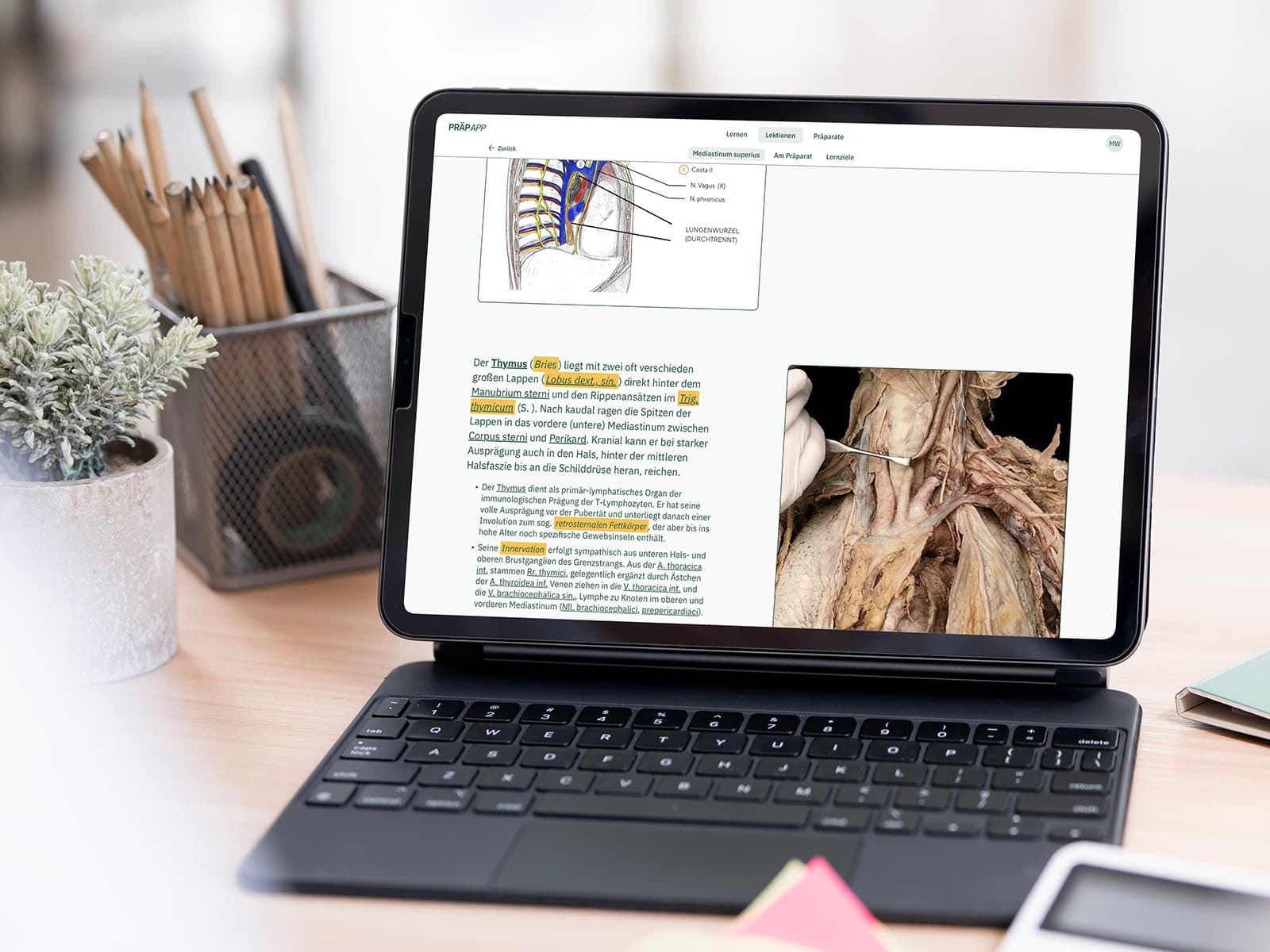 Mit der PräpApp kannst du systematisch für deine Anatomieprüfungen lernen. Schrittweise führen die Theorie-Kapitel durch die einzelnen Themenbereiche. Die Texte werden durch Zeichnungen, Fotografien und interaktive 360°-Ansichten von einzigartigen anatomischen Präparationen und Sektionen ergänzt und ermöglichen es, Anatomie ganzheitlich zu lernen und zu verstehen.